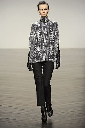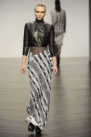 They’re also famous for their monochrome prints, one of which Sienna was wearing. The AW13 collection had the same grey/black/white tones in different prints. The tailoring included a short leather Jacket, a jacket with de-constructed sleeves and plenty of caped tops – both at the front and back with long leather gloves. I loved all of these as they’re easily worn in a wheelchair. In particular the capes (they can hide my stomach when sitting) and the gloves which are really elegant and good for wheel pushing – if a little extravagant for just keeping your hands clean and free from calluses.