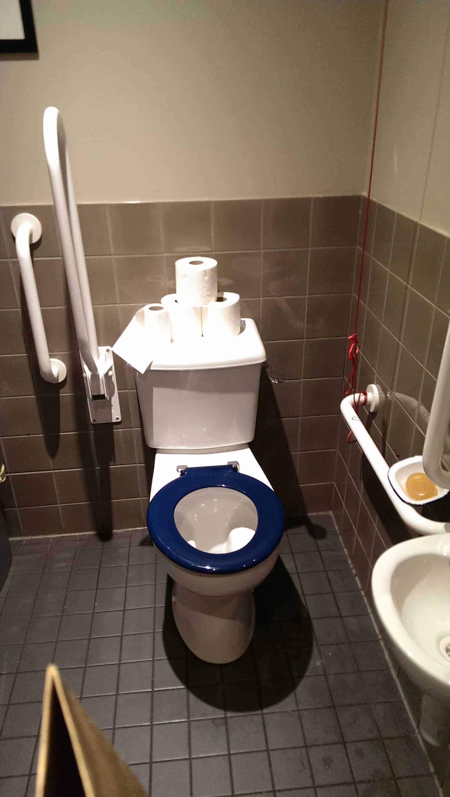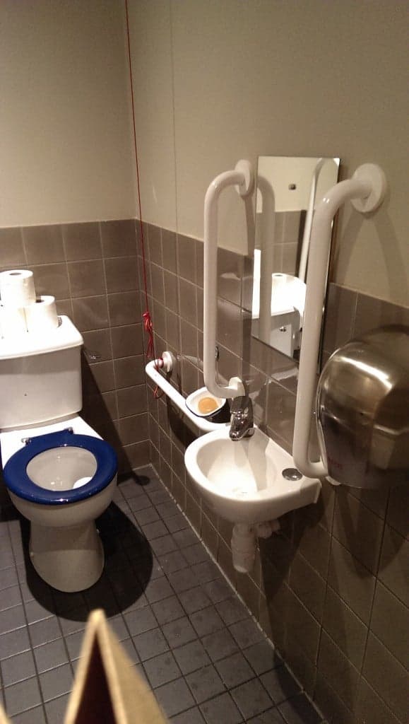 The disabled loo was “the usual” – just about big enough but not when you store “other items” in it (Pint Shop please note). The support bars either side of the loo were in the “up” position but why are they so difficult to pull down. The red alarm cord tied up so it did not reach the floor (who trains the cleaners?). Not sure what the bars either side of the mirror are supposed to do.